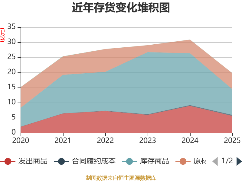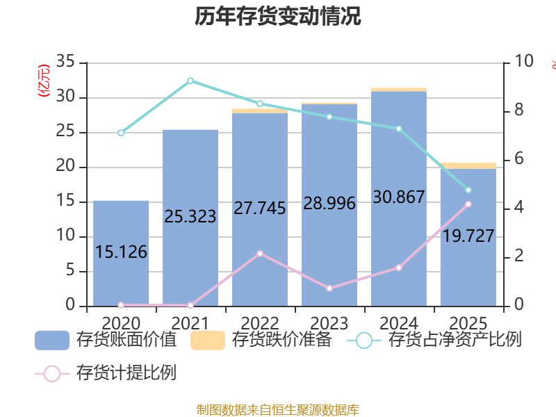 从存货变动来看,为止2025年末,公司存货账面价值为19.73亿元,占净财富的4.76%,较上年末减少11.14亿元。其中,存货跌价准备为8613.81万元,计提比例为4.18%。