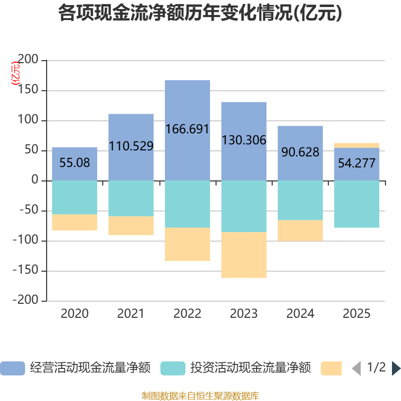 为止2025年,公司筹办举止现款流净额为54.28亿元,同比着落40.11%;筹资举止现款流净额7.9亿元,同比增多42.35亿元;投资举止现款流净额-78.53亿元,上年同时为-66.16亿元。